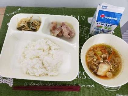 今日の献立は、鶏肉のゆず塩焼き、ソーキ汁、もやしとさんどまめの甘酢あえ、ごはん、牛乳です。