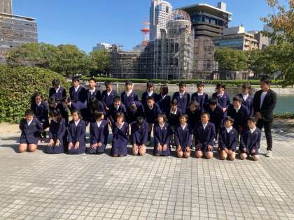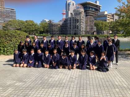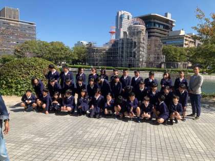 修繕中の 原爆ドームに着きました。クラスごとに写真撮影をしました。次は原爆の子の像に向かいます。