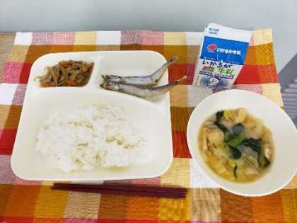 今日の献立は、焼きししゃも、五目汁、きんぴらごぼう、ごはん、牛乳です。