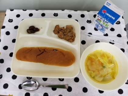 今日の献立は、豚肉のデミグラスソース、スープ、うずら豆のグラッセ、レーズンパン、牛乳です。