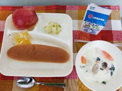 今日の献立は、きのこのクリームシチュー、キャベツのピクルス、りんご、大型コッペパン、マーマレード、牛乳です。