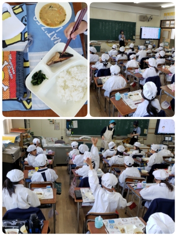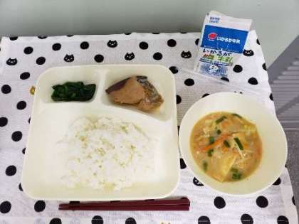 今日の献立は、なまりぶしのしょうが煮、みそ汁、ほうれんそうのおひたし、ごはん、牛乳です。
