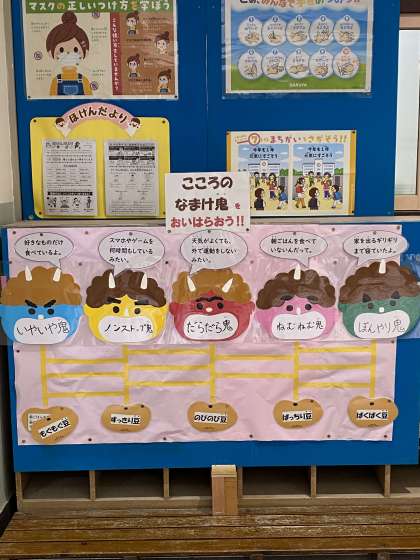 保健室前にもこころのなまけ鬼とそれを退治する豆(アドバイス)を掲示していますので、ぜひ見てください。
