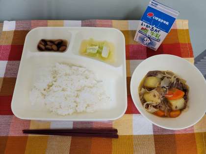 今日の献立は、肉じゃが、はくさいのゆず風味、とら豆の煮もの、ごはん、牛乳です。
