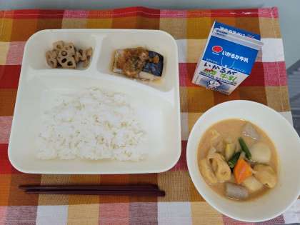 今日の献立は、さごしのおろしじょうゆかけ、一口がんもとさといものみそ煮、れんこんのいためもの、ごはん、牛乳です。