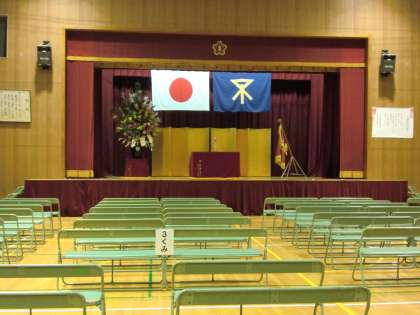 新型コロナウイルスの感染予防のため、明日の入学式ではご家族に1脚の長イスをご用意しています。マスク着用や検温票の提出等、ご不便をおかけしますが、感染拡大防止の趣旨をご理解のうえ、ご協力をお願いいたします。