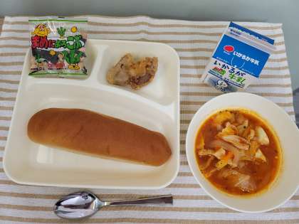 今日の献立は、一口トンカツ、ミネストローネ、豆こんぶ、黒糖パン、牛乳です。