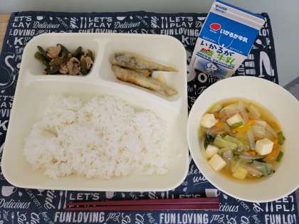 今日の献立は、いわしてんぷら、五目汁、豚肉とさんどまめのいためもの、ごはん、牛乳です。
