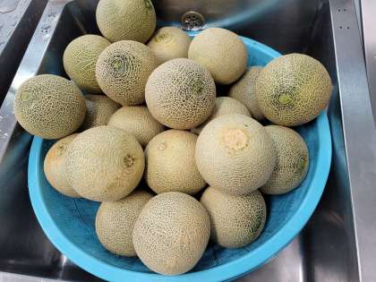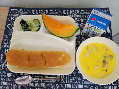 今日の献立は、かぼちゃのクリームシチュー、ミックス海そうのサラダ、クインシーメロン、おさつパン、牛乳です。