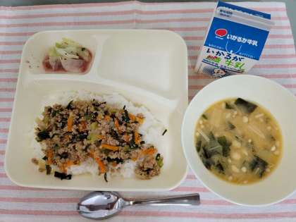 今日の献立は、豚ひき肉とにらのそぼろ丼、みそ汁、キャベツの赤じそあえ、牛乳です。