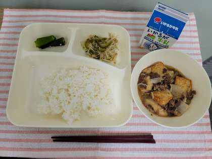 今日の献立は、すき焼き煮、オクラのかつお梅風味、もやしとピーマンのごまいため、ごはん、牛乳です。