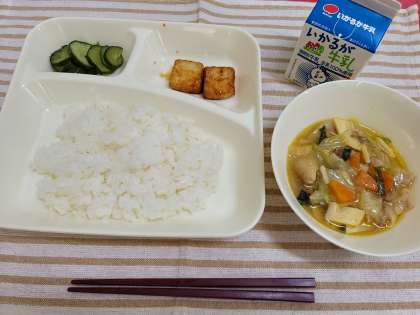 今日の献立は、中華煮、あつあげのピリ辛じょうゆかけ、きゅうりの中華あえ、ごはん、牛乳です。