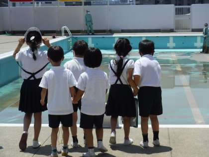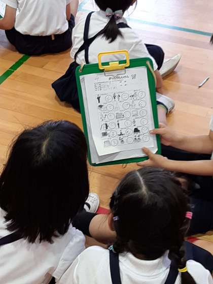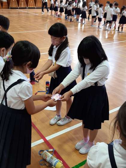 いろいろな教室を説明した後、文字をカードにかきます。文字をあつめると、「がっこうでげんきにたのしくまなびしょう」となります。文字を書くのを一年生にしてもらったりしました。プールに入ることができ、その大きさにびっくり!!今年はプール学習があるので、プールをみてうれしそうでした。最後に、折り紙で折ったメダルを「これからもなかよくしてね」のメッセージと共にわたしました。とっても楽しい一日になりました♪♪♪