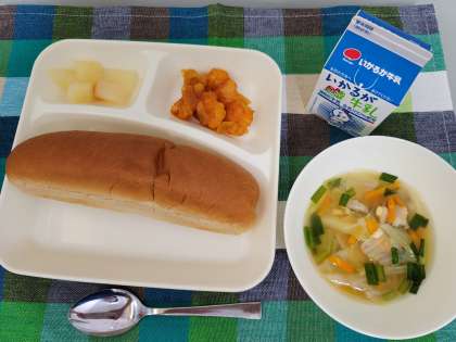 今日の献立は、えびのチリソース、中華スープ、和なし(カット缶)、黒糖パン、牛乳です。