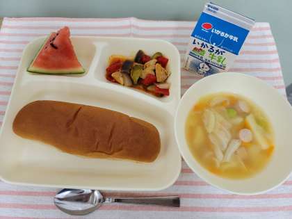 今日の献立は、鶏肉と夏野菜のソテー、押麦のスープ