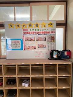 保健室前に本物のAEDを展示しています。(使用期限の切れたものです。バッテリーを抜いているため音や電流は流れません。)近くで見たり触れたりする機会が少ないと思うので、ぜひご覧ください。