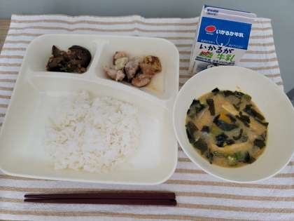 今日の献立は、焼きとり、みそ汁、なすのそぼろいため、ごはん、牛乳です。