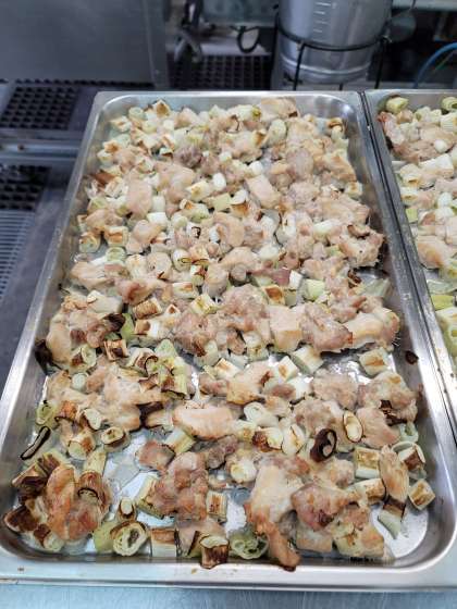 今日の焼きとりは、しょうが汁で下味をつけて焼いた鶏肉と白ねぎに、とろみをつけた甘辛いタレをかけています。ごはんによく合う一品です。
