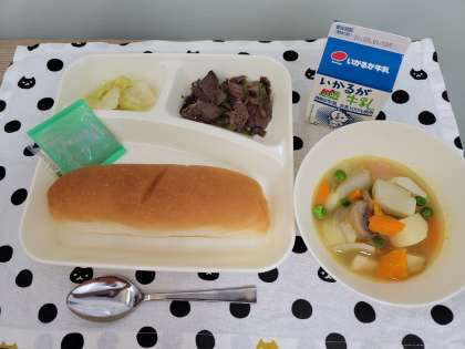 今日の献立は、牛肉の香味焼き、スープ煮、サワーキャベツ、大型コッペパン、りんごジャム、牛乳です。