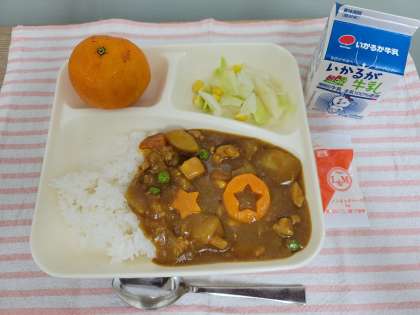今日の献立は、チキンカレーライス(米粉)、みかん(冷)、キャベツとコーンのサラダ(ノンエッグドレッシング)、牛乳です。