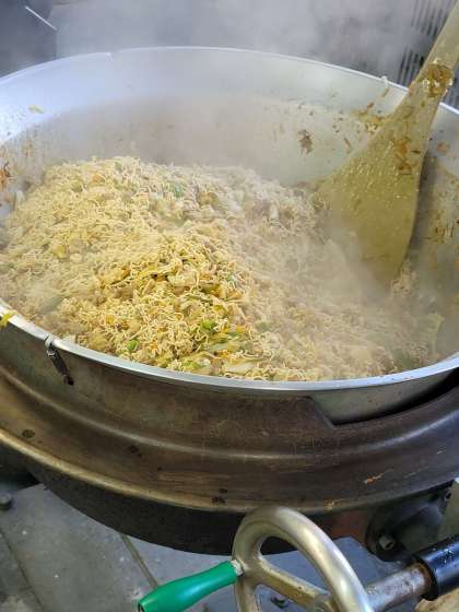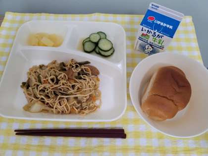 今日の献立は、焼きそば、きゅうりのしょうがづけ、パインアップル(カット缶)黒糖パン1/2、牛乳です。