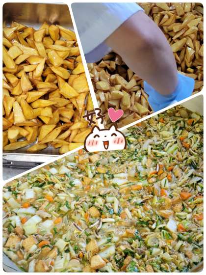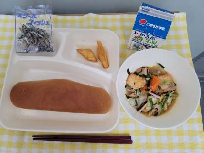 今日の献立は、豚肉といかの中華煮、大学いも、ミニフィッシュ、黒糖パン、牛乳です。