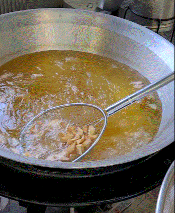 大学いもは、さつまいもを油で揚げ、さとう、塩、しょうゆなどで作ったみつをからませて作ります。