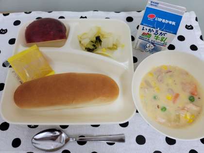 今日の献立は、コーンクリームシチュー[米粉]、はくさいのピクルス