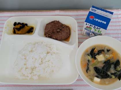 今日の献立は、和風ハンバーグ、とうふのみそ汁、かぼちゃのいとこ煮、ごはん、牛乳です。