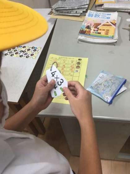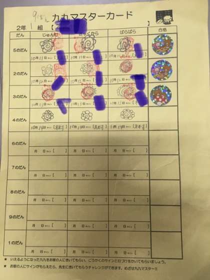 二年生は今、九九を覚えています。「じゅんに」「ぎゃくから」「バラバラ」で言えるようにしています。「じゅんに」と「ぎゃくから」は、カードの答えの部分を隠しながらおぼえるようにしています。「バラバラ」は、カードをばらばらにして覚えています。おうちの人に合格をもらってから、担任の先生に聞いてもらって合格になります。がんばれ!!二年生!!