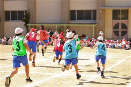 6年生の玉入れ、リレーの様子です。