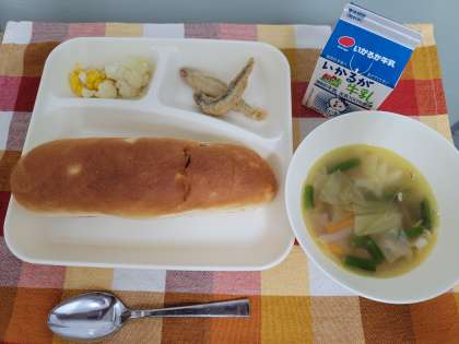 今日の献立は、わかさぎフライ、スープ、カリフラワーとコーンのサラダ、おさつパン、牛乳です。