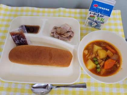 今日の献立は、豚肉のガーリック焼き、ケチャップ煮、うずら豆のグラッセ、大型コッペパン、いちごジャム、牛乳です。