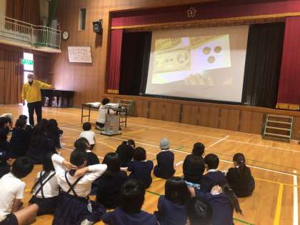 登校の時、いつも子どもたちを見守り、地域のことで、大変お世話になっています松阪会長様に来ていただき、地域の歴史と戦後のお話を教えていただきました。地域で活動されている松阪様の貴重なお話を聞き、子どもたちは驚きと発見とで、目を輝かして聞いてました。また、当時のお札や小銭を見せていただいた時は、興味津々で見ていました。