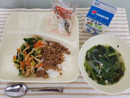 今日の献立は、ビビンバ、わかめスープ、アーモンドフィッシュ、牛乳です。