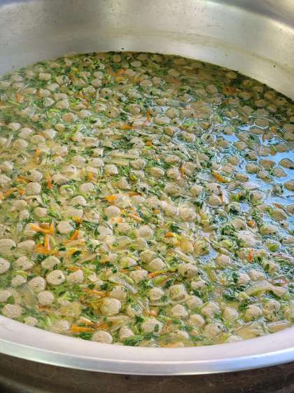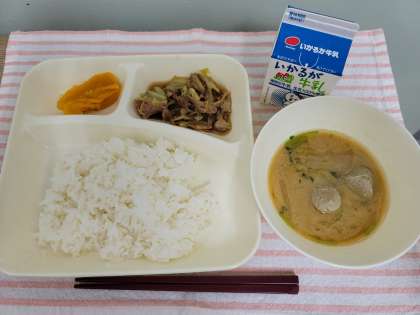 🌟今日はいわしだんご、だいこん、ごぼう、にんじん、みつばなど使った汁物です。具だくさんの汁は体が温まるため、寒い冬によく食べられます。
