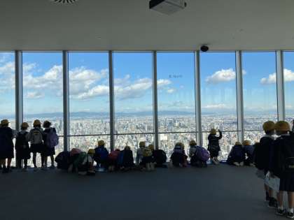 12日は社会見学であべのハルカスへ行きました。60階から見る、大阪平野の景色は素晴らしく、東西南北に見えるものを、ワークシートを使ってまとめていました。また、今回は、班で協力して見学し、集合時間を意識しながら活動できていました。