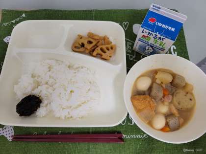 今日の献立は、関東煮、れんこんの梅風味焼き、のりのつくだ煮、ごはん、牛乳です。