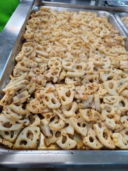 下の写真は、【れんこんの梅風味焼き】です。ほんのり梅風味のシャキシャキした食感のれんこんは児童にも大変好評でした。