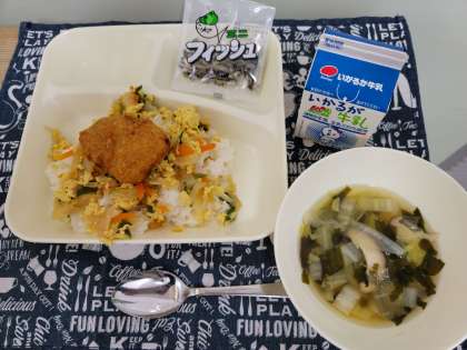 今日の献立は、カツ丼、すまし汁、ミニフィッシュ、牛乳です。