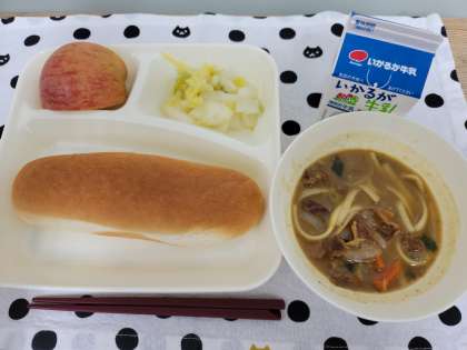 今日の献立は、カレーうどん、はくさいの甘酢あえ、りんご、大型コッペパン、ソフトマーガリン、牛乳です。
