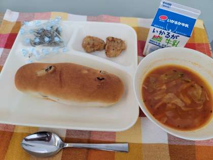 今日の献立は、一口トンカツ、ミネストローネ、ミニフィッシュ、レーズンパン、牛乳です。