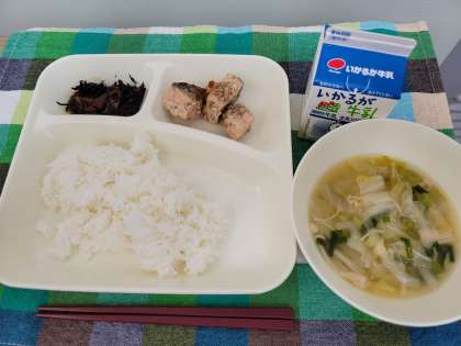 今日の献立は、さけのごまみそ焼き、五目汁、ひじきのいため煮、ごはん、牛乳です。