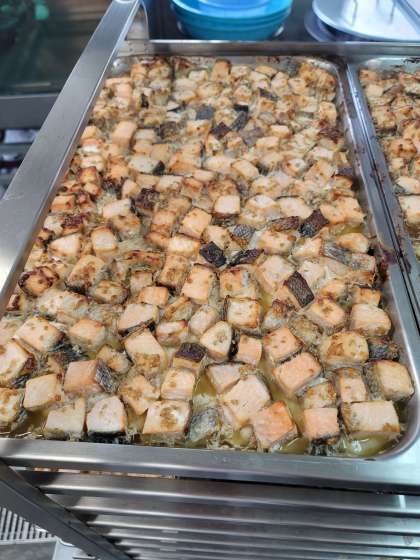 角切りのさけに、ねりごま 砂糖 うすくちしょうゆ 白みそで下味をつけ、いりごまを振って焼いています。コクのある味つけでごはんがすすみます🍚🥢