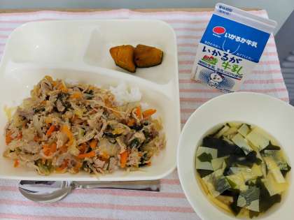 今日の献立は、豚丼、湯葉のすまし汁、かぼちゃのしょうゆ焼き、牛乳です。