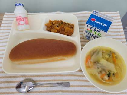今日の献立は、じゃがいものミートグラタン、スープ、発酵乳、黒糖パン、牛乳です。