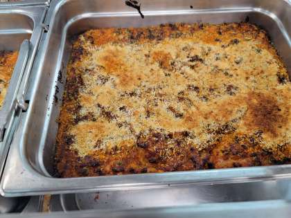 下の写真は、【じゃがいものミートグラタン】です。じゃがいもにケチャップ味のミートソースを合わせてパン粉をかけて焼いています。粉チーズを使用していまいので、乳アレルギーの児童にも食べることができます。焦げ目が香ばしく児童にもたいへん人気の献立です。