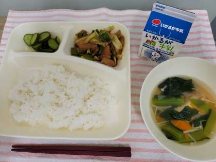 きゅうりのピリ辛あえ、ごはん、牛乳です。