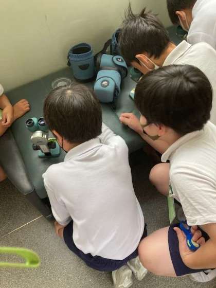 休み時間にも、顕微鏡を使い観察をしています。「本当によう虫が卵の殻を食べていてビックリ!」「今、キャベツを食べているのが見れたよ!」「脱皮した皮もたべてるよ!」など驚きの連続で、とっても楽しんで観察中です。ご家庭でも、お話を聞いてみてください。