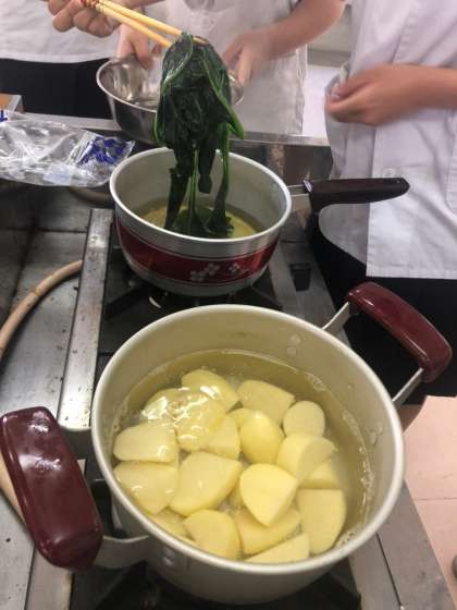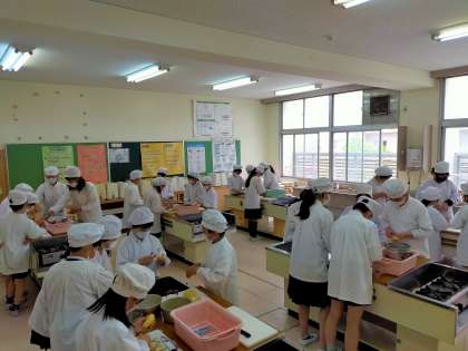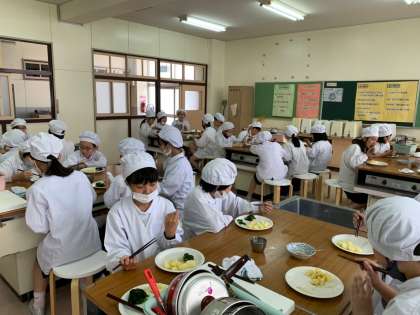 今週、五年生は家庭科で調理実習を行いました。初めての学校での実習で、しっかりと注意事項を聞きながら、仲間と協力して、安全に調理を行うことができました。試食の際はシンプルな味付けで、素材そのものの味のおいしさを感じることができました。